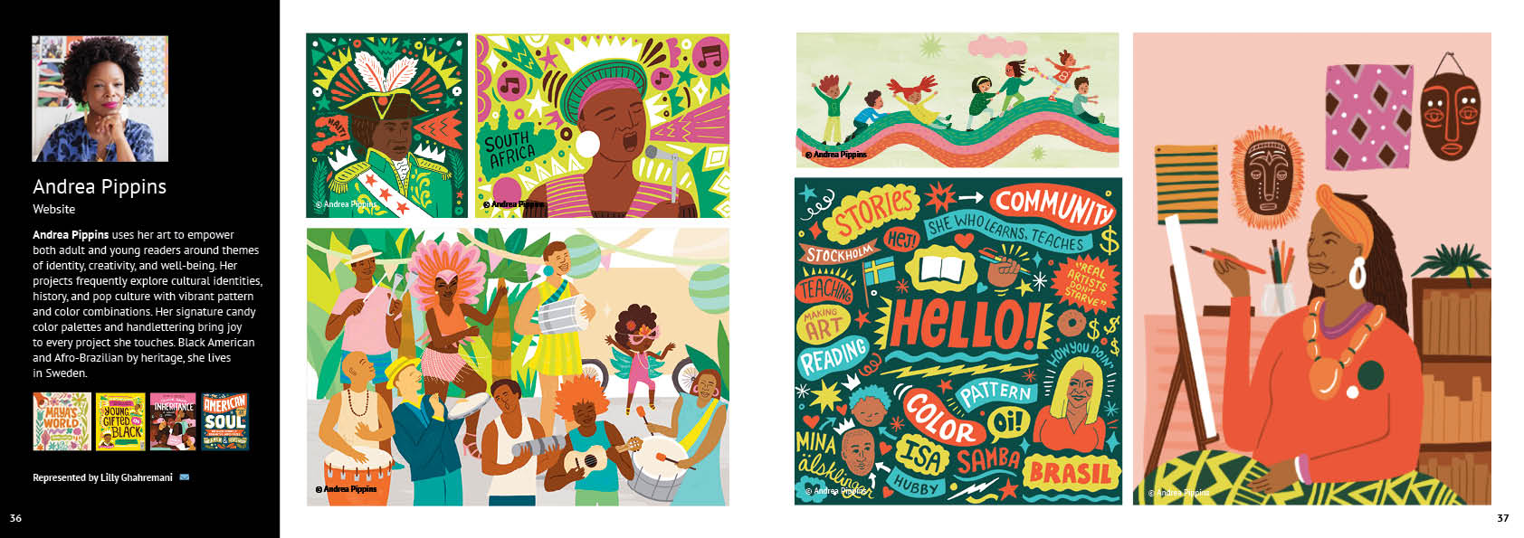 Andrea Pippins is an illustrator and author passionate about creating images that reflect what she wants to see in art, media, and design – empowerment, hope, joy, inclusivity, and celebrations of the arts and culture. She enjoys inspiring people of all ages to nurture their own creativity. Originally a graphic designer, Andrea’s versatility now lends itself to everything from vibrant line drawings and hand lettering to full-color illustration.