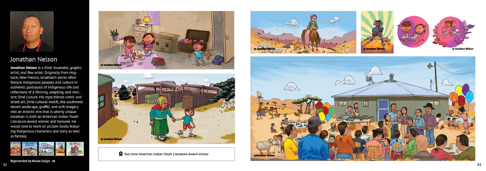 In 2025, Heartdrum published Yáadilaá (Good Grief) by Laurie Goodluck. His non-traditional superhero comic, The Wool of Jonesy (Native Realities) was an American Indian Youth Literature Award Honor Book. He was a contributing author and illustrator of Tales of the Mighty Code Talkers, Volume One (Native Realities), which was a Great Graphic Novels for Teens pick and received the American Indian Youth Literature Award. He illustrated First Laugh-Welcome Baby by Rose Anne Tahe and Nancy Bo Flood (Charlesbridge), which was a Junior Library Guild Selection, a Notable Social Studies Book, a New York Public Library’s Best Book, and a Bank Street Best Book, among other accolades. For Hey, Dog by Tony Johnston (Charlesbridge), Kirkus praised his illustrations: “Nelson is a master at capturing nuance in facial expression and body language, both human and canine.”
