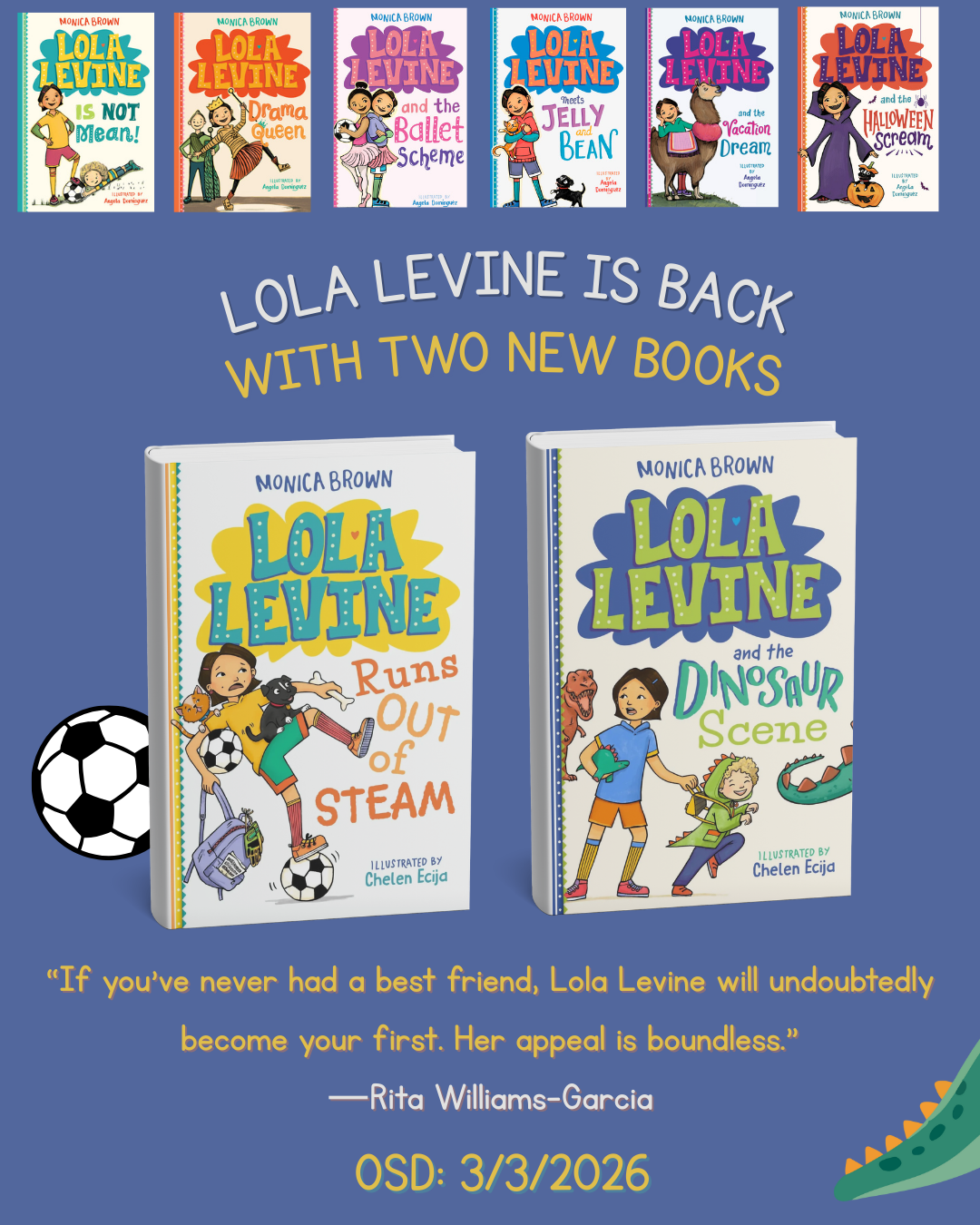 Monica’s LOLA LEVINE chapter book series stars a biracial, bicultural second grader. Lola Levine Is Not Mean! was named a Kirkus Reviews Best Middle Grade Book of the Year, a School Library Journal Top 10 Latin@ Book, and a New York Public Library 100 Books for Reading and Sharing. Two new books in the series are coming in spring 2026–Lola Levine Runs Out of Steam, and Lola Levine and the Dinosaur Scene (Little Brown). Monica is also the co-author of the Sarai Gonzalez chapter book series, with 12-year-old social activist and “Soy Yo” video star. The fictional series based on Sarai’s life, Sarai and the Meaning of Awesome, Sarai in the Spotlight, Sarai Saves the Music, and Sarai and the Around the World Fair, are available in English and Spanish editions.