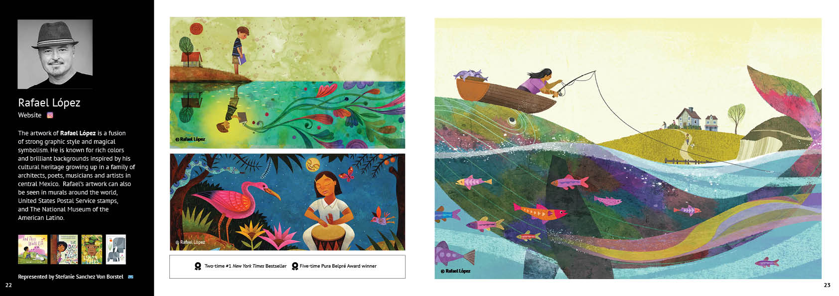 Rafael is the two-time #1 New York Times bestselling illustrator of The Day You Begin, by Jacqueline Woodson (Nancy Paulsen/Penguin) and Just Ask! by Sonia Sotomayor (Philomel/Penguin), which received the ALA Schneider Family Book Award for Young Children. He is the three-time Pura Belpré Medal award-winning illustrator of Dancing Hands by Margarita Engle (Simon & Schuster), Drum Dream Girl by Margarita Engle (Clarion) Book Fiesta! by Pat Mora, (Harper); and the four-time Pura Belpré Honor award-winning illustrator of Tito Puente: Mambo King/Rey del mambo by Monica Brown (Harper), BRAVO! Poems About Amazing Hispanics by Margarita Engle (Holt), My Name Is Celia by Monica Brown (R&L), and The Cazuela That the Farm Maiden Stirred by Susan Vamos (Charlesbridge). His picture book Maybe Something Beautiful by F. Isabel Campoy and Theresa Howell (Clarion), was awarded the Tomás Rivera Mexican American Book Award, ALA Notable Book, and Jumpstart “Read for the Record” Book. The Year We Learned to Fly by Jacqueline Woodson (Nancy Paulsen/Penguin) was a NYT bestseller and Kirkus Prize finalist. New in 2025: And They Walk On by Kevin Maillard coming this fall from Roaring Brook Press.